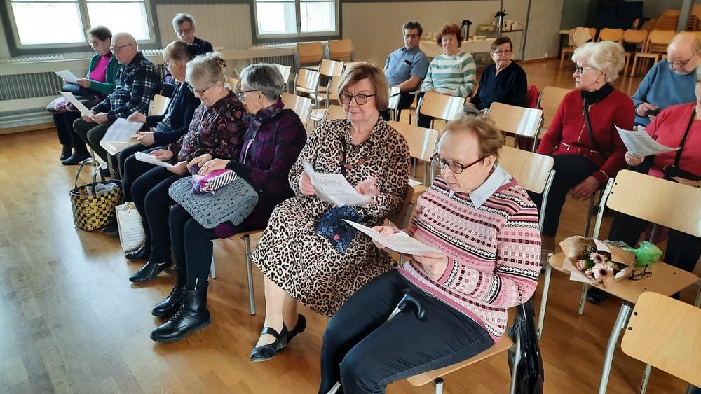 Haukiputaan Eläkeläisjärjestöjen virkistystoimikunnan keväinen laulutapahtuma toteutettiin tänä vuonna Kellon Nuorisoseuralla. Useimpina aikaisempina vuosina tilaisuus on pidetty Heiton talossa Haukiputaalla. Paikalle oli saapunut eri eläkeläisjärjestöistä parisenkymmentä laulajaa. Enemmänkin olisi tilavaan saliin sopinut, mutta ehkä aurinkoisen lämmin sää ei suosinut sisätiloissa järjestettävää tapahtumaa. Tai ehkä järjestöihmisiä vaivaa jo kevätväsymys ja kesätyöt kotipihalla ovat kiinnostavampia.