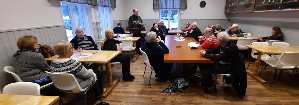 Vuoden viimeinen kerhopäivä 20.11 oli jouluinen sillä perinteisten porinoiden lisäksi nautimme joulupuuron luumukisselillä höystettynä ja joimme torttukahvit. Bingossakin noudatimme aikaisempaa käytäntöä, sillä kenenkään ei tarvinnut tuoda pingoon palkintoa, vaan sen hankki yhdistys ja päävoitto oli perinteinen joulukinkku. Kinkkua ei paikalla näkynyt, sen korvasi lahjakortti ja sillä onnellinen voittaja sai kinkun lunastaa paikallisesta K-kaupasta. Alkupalkintoina oli suklaata ja kahvia. Tiukaksi meni, sillä voittorivit löytyivät kahdelta pelaajalta. Kinkun voittajaksi selviytyi arvonnan jälkeen Pentti ja näin Taipaleenmäellä paistuu ja maistuu makoisa possun potka ensi jouluna. Onnittelut Pentille.