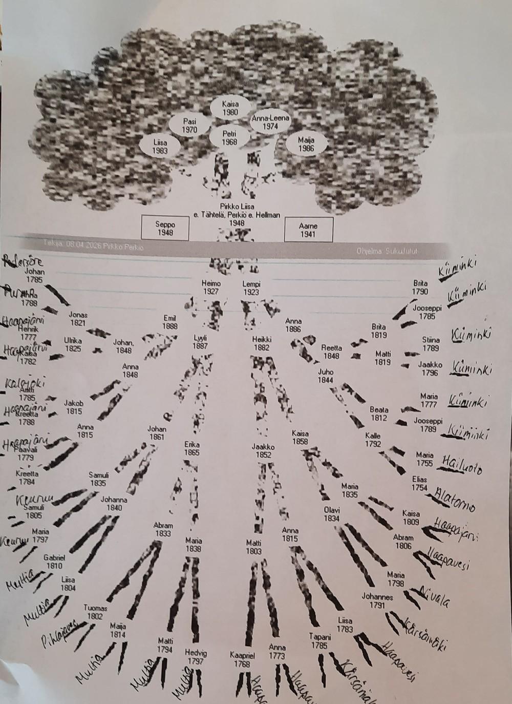 Hän kertoi meille omia kokemuksiaan selvittäessään oman sukunsa historiaa. Tietoa on kertynyt jo kahdeksan sukupolven ajalta aina 1700 luvun puoliväliin asti. Sukuhaaroja on löytynyt runsaasti sekä kotimaasta että maailmalta laajemminkin. Etäisimmät sukulaiset olen löytänyt USA:sta ja sukua on myös Ruotsissa ja taitaa olla muissakin lähimaissa.